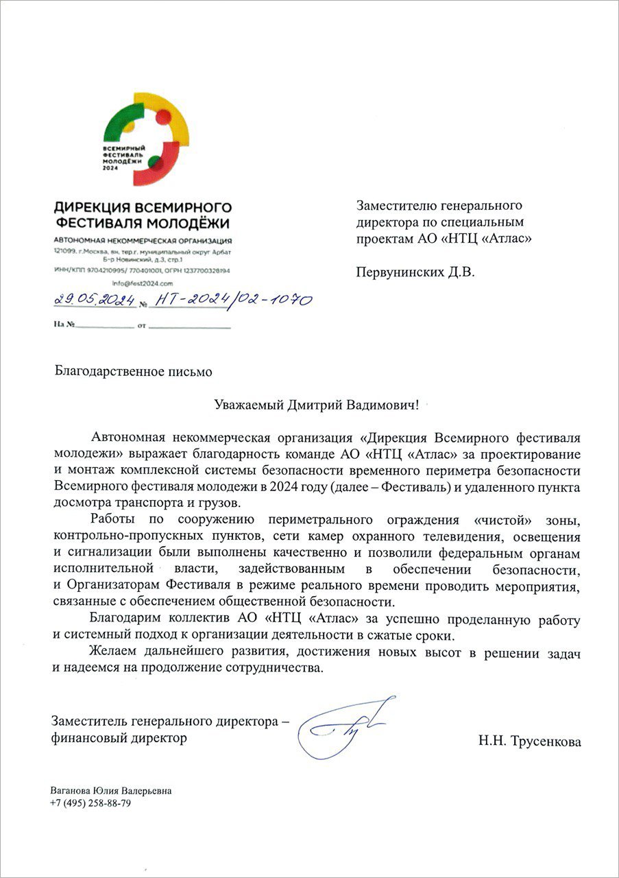 АО «НТЦ «Атлас» получена благодарность от Дирекции Всемирного фестиваля молодежи за проектирование и реализацию комплексной системы безопасности временного периметра безопасности Всемирного фестиваля молодежи в 2024 году и удаленного пункта досмотра транспорта и грузов
